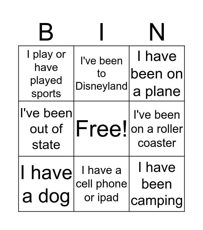 This bingo card has a free space and 11 words: I have a piercing, I have a cell phone or ipad, I have been camping, I have a dog, I've been to Disneyland, I have been on a plane, I've been on a roller coaster, I've been to the snow, I've been out of state, I play or have played sports and I can dance.