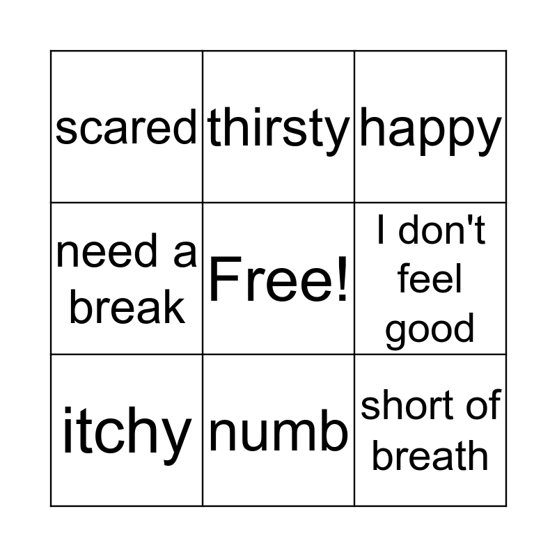 This bingo card has a free space and 20 words: hot, cold, happy, sad, feeling sick, short of breath, angry, scared, hungry, thirsty, nauseous, healthy, I don't feel good, hurt, itchy, bleeding, numb, need a break, sleepy and sneezy.