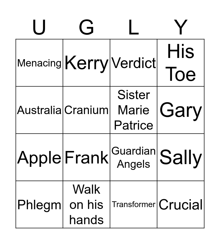 This bingo card has 17 words: Transformer, Phlegm, Verdict, Menacing, Frank, His Toe, Sally, Sister Marie Patrice, Gary, Cranium, Walk on his hands, Guardian Angels, Australia, Kerry, Apple, His leg and Crucial.