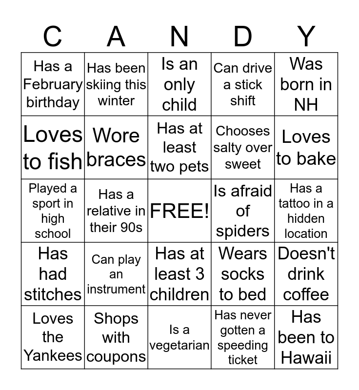 This bingo card has a free space and 24 words: Can play an instrument, Shops with coupons, Has at least two pets, Loves the Yankees, Was born in NH, Has a February birthday, Loves to fish, Has been skiing this winter, Is afraid of spiders, Has at least 3 children, Chooses salty over sweet, Played a sport in high school, Wears socks to bed, Doesn't drink coffee, Wore braces, Has never gotten a speeding ticket, Has a tattoo in a hidden location, Is an only child, Loves to bake, Has a relative in their 90s, Has been to Hawaii, Has had stitches, Can drive a stick shift and Is a vegetarian.