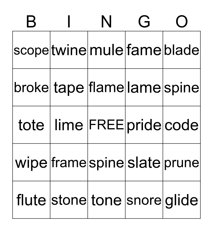 This bingo card has a free space and 24 words: frame, stone, flame, flute, blade, scope, broke, twine, pride, spine, lame, tote, slate, prune, tape, snore, code, mule, spine, lime, glide, wipe, fame and tone.