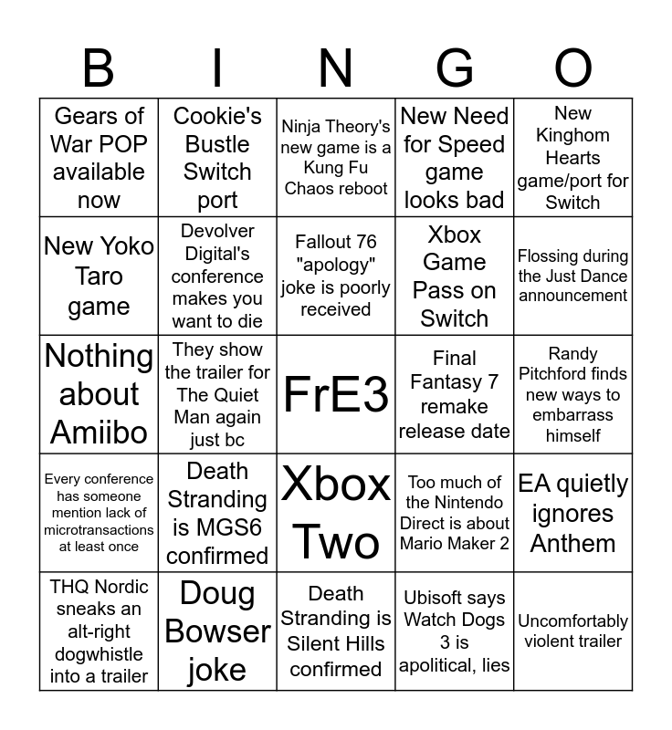 This bingo card has a free space and 24 words: Death Stranding is MGS6 confirmed, Doug Bowser joke, Fallout 76 "apology" joke is poorly received, THQ Nordic sneaks an alt-right dogwhistle into a trailer, New Kinghom Hearts game/port for Switch, Gears of War POP available now, New Yoko Taro game, Cookie's Bustle Switch port, Final Fantasy 7 remake release date, Xbox Two, Xbox Game Pass on Switch, Nothing about Amiibo, Too much of the Nintendo Direct is about Mario Maker 2, EA quietly ignores Anthem, Devolver Digital's conference makes you want to die, Ubisoft says Watch Dogs 3 is apolitical, lies, Randy Pitchford finds new ways to embarrass himself, Ninja Theory's new game is a Kung Fu Chaos reboot, Flossing during the Just Dance announcement, They show the trailer for The Quiet Man again just bc, Uncomfortably violent trailer, Every conference has someone mention lack of microtransactions at least once, New Need for Speed game looks bad and Death Stranding is Silent Hills confirmed.