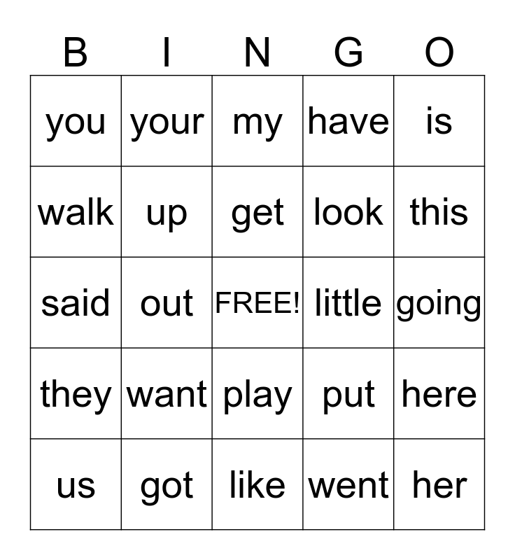 This bingo card has a free space and 24 words: want, got, get, us, is, you, walk, your, little, play, look, said, put, here, up, went, going, my, this, out, her, they, have and like.