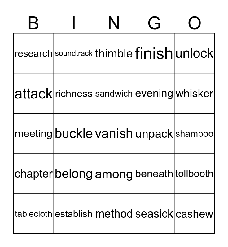 This bingo card has a free space and 24 words: belong, establish, sandwich, tablecloth, unlock, research, attack, soundtrack, unpack, among, evening, meeting, beneath, tollbooth, richness, seasick, shampoo, thimble, whisker, buckle, cashew, chapter, finish and method.