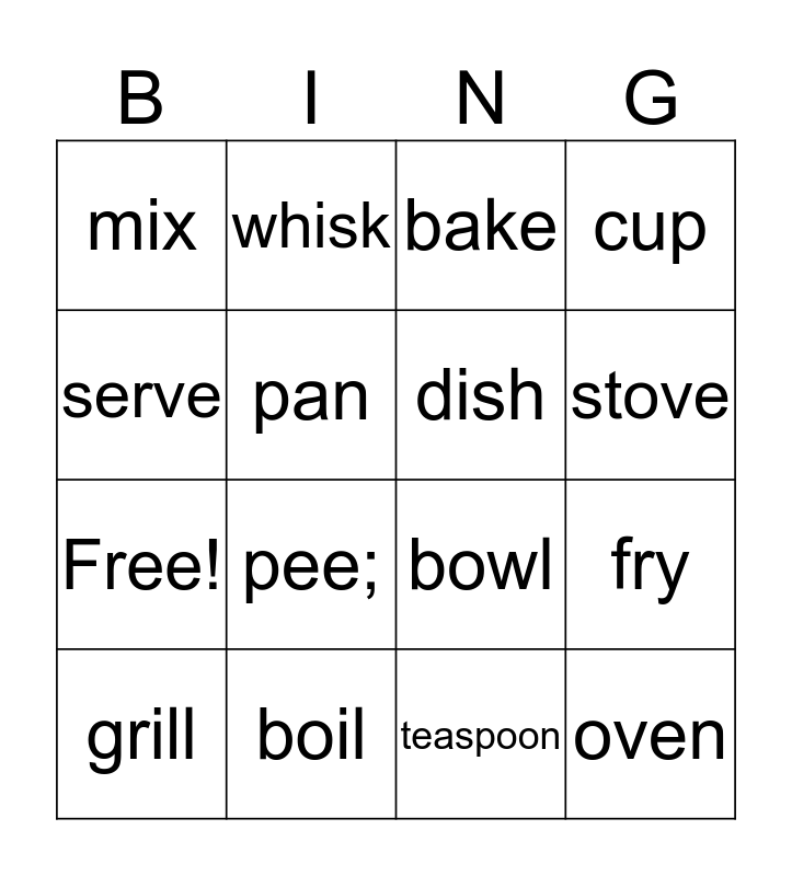 This bingo card has 20 words: fry, cut, bake, pour, grill, serve, boil, mix, Free!, whisk, pee;, bowl, pan, oven, dish, knife, stove, cup, teaspoon and pot.