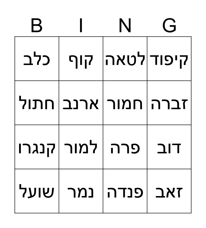 This bingo card has 24 words: סוס, גירפה, זברה, אריה, חתול, כלב, ארנב, קוף, נמר, קואלה, קנגרו, פרה, חזיר, דג, חמור, זיקית, פנדה, לטאה, למור, דוב, שועל, זאב, קיפוד and נשר.