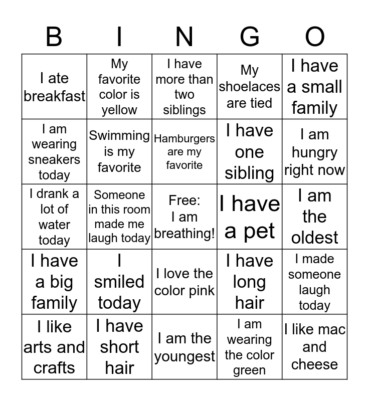 This bingo card has a free space and 24 words: I smiled today, I have short hair, Hamburgers are my favorite, I like arts and crafts, I have a small family, I ate breakfast, I am wearing sneakers today, My favorite color is yellow, I have a pet, I love the color pink, I have one sibling, I drank a lot of water today, I have long hair, I made someone laugh today, Swimming is my favorite, I am wearing the color green, I am the oldest, I have more than two siblings, I am hungry right now, Someone in this room made me laugh today, I like mac and cheese, I have a big family, My shoelaces are tied and I am the youngest.