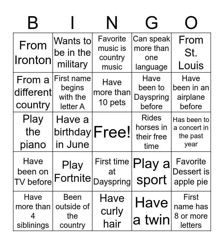 This bingo card has a free space and 24 words: Play Fortnite, Been outside of the country, Have more than 10 pets, Have more than 4 siblinings, From St. Louis, From Ironton, From a different country, Wants to be in the military, Rides horses in their free time, First time at Dayspring, Have been to Dayspring before, Play the piano, Play a sport, Favorite Dessert is apple pie, First name begins with the letter A, Have a twin, Has been to a concert in the past year, Favorite music is country music, Have been in an airplane before, Have a birthday in June, First name has 8 or more letters, Have been on TV before, Can speak more than one language and Have curly hair.