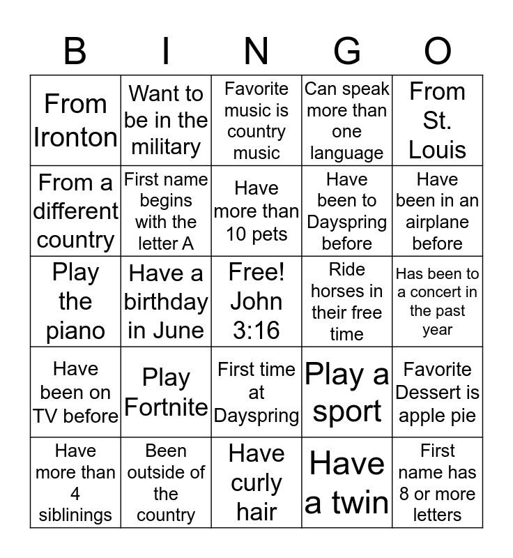 This bingo card has a free space and 24 words: Play Fortnite, Been outside of the country, Have more than 10 pets, Have more than 4 siblinings, From St. Louis, From Ironton, From a different country, Want to be in the military, Ride horses in their free time, First time at Dayspring, Have been to Dayspring before, Play the piano, Play a sport, Favorite Dessert is apple pie, First name begins with the letter A, Have a twin, Has been to a concert in the past year, Favorite music is country music, Have been in an airplane before, Have a birthday in June, First name has 8 or more letters, Have been on TV before, Can speak more than one language and Have curly hair.