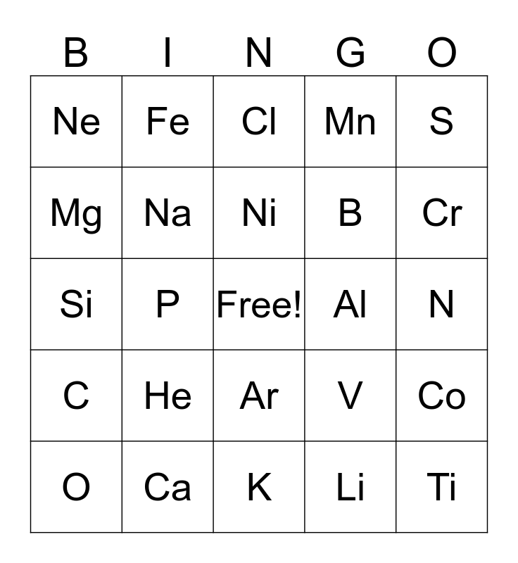 This bingo card has a free space and 29 words: O, Sc, P, H, Ne, Cl, Na, He, Al, Ca, N, Ti, K, Li, Cr, Be, Ar, C, S, Si, V, F, B, Mg, Mn, Fe, Co, Ni and Cu.