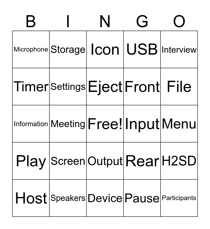 This bingo card has a free space and 29 words: Host, Audio, Meeting, Connect, Microphone, Icon, Settings, Screen, Input, Speakers, Menu, Participants, Device, Pause, File, Zoom, Output, Play, Interview, Information, Rear, Surround 2CH, Front, Timer, USB, Storage, H2SD, Eject and Amplify.