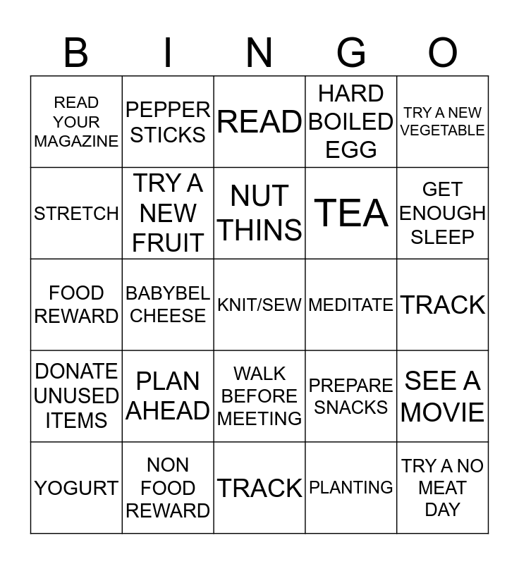 This bingo card has a free space and 34 words: WALKING, PLANTING, CALL A FRIEND, EMAIL A FRIEND, DONATE UNUSED ITEMS, TRY A NEW FRUIT, TRY A NEW VEGETABLE, YOGURT, PEPPER STICKS, HUMMUS, NUT THINS, READ, VOLUNTEER, SIMPLIFY, MEDITATE, GET ENOUGH SLEEP, NON FOOD REWARD, FOOD REWARD, PLAN AHEAD, PREPARE SNACKS, WALK BEFORE MEETING, ASK FOR HELP IF YOU NEED IT, READ YOUR MAGAZINE, TRACK, TRACK, TRY A NO MEAT DAY, HARD BOILED EGG, POPCORN, TEA, STRETCH, CHAIR EXERCISE, BABYBEL CHEESE, SEE A MOVIE and OATMEAL.