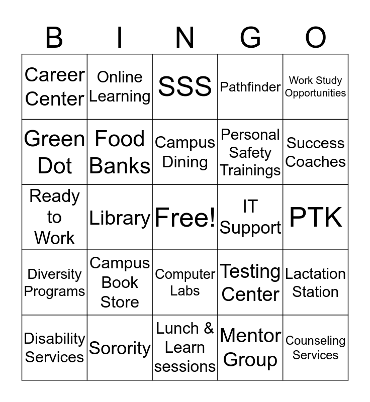 This bingo card has a free space and 29 words: Disability Services, Tutoring, Library, Scholarships, Career Center, SSS, Food Banks, Campus Book Store, IT Support, Sorority, PTK, Counseling Services, Lunch & Learn sessions, Mentor Group, Success Coaches, Writing Center, Computer Labs, Diversity Programs, Work Study Opportunities, Ready to Work, Testing Center, President Chats, Personal Safety Trainings, Green Dot, Pathfinder, Online Learning, Lactation Station, Campus Dining and MCTC.