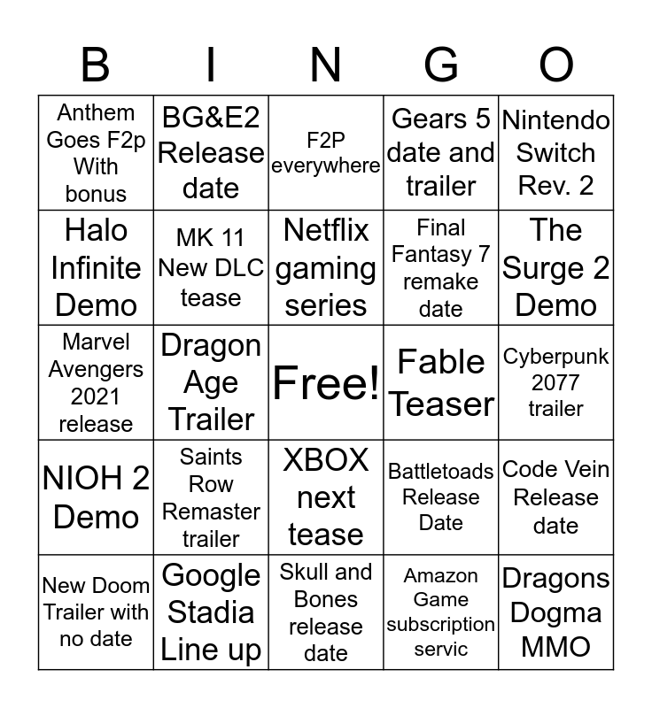 This bingo card has a free space and 24 words: Saints Row Remaster trailer, Google Stadia Line up, Netflix gaming series, New Doom Trailer with no date, Nintendo Switch Rev. 2, Anthem Goes F2p With bonus, Halo Infinite Demo, BG&E2 Release date, Fable Teaser, XBOX next tease, Final Fantasy 7 remake date, Marvel Avengers 2021 release, Battletoads Release Date, Code Vein Release date, MK 11 New DLC tease, Amazon Game subscription servic, Cyberpunk 2077 trailer, F2P everywhere, The Surge 2 Demo, Dragon Age Trailer, Dragons Dogma MMO, NIOH 2 Demo, Gears 5 date and trailer and Skull and Bones release date.