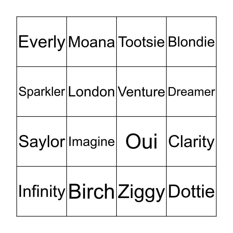 This bingo card has 24 words: Retro, Crepe, Dreamer, Flash, Sparkler, Everly, London, Moana, Birch, Starling, Saylor, Oui, Tallon, Tillie, Venture, Je tamie, Ziggy, Tootsie, Imagine, Clarity, Infinity, Dottie, Blondie and Quartzy.
