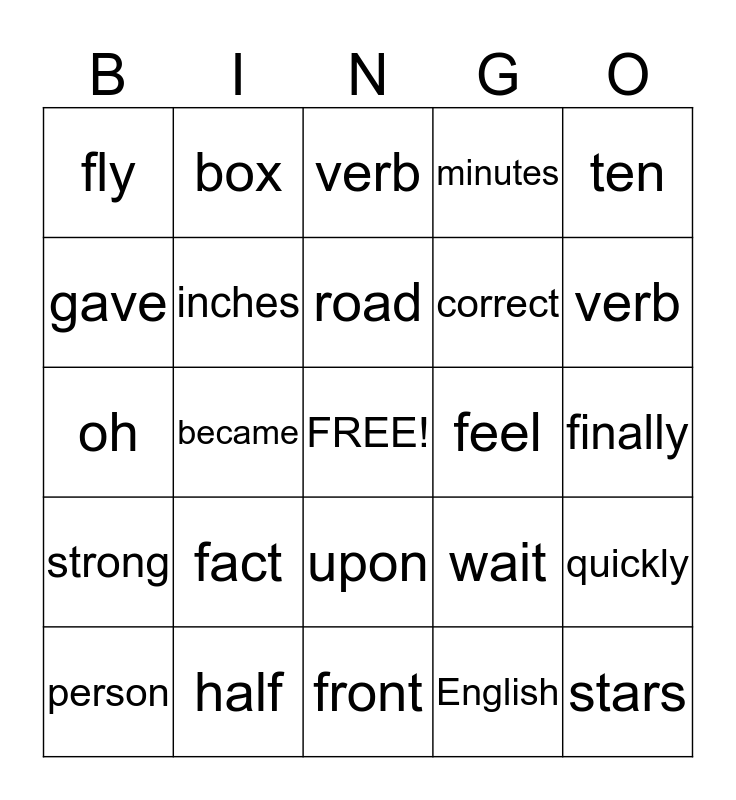 This bingo card has a free space and 26 words: upon, English, road, half, ten, fly, gave, box, finally, wait, correct, oh, quickly, person, became, shown, minutes, strong, verb, stars, verb, front, feel, fact, inches and street.