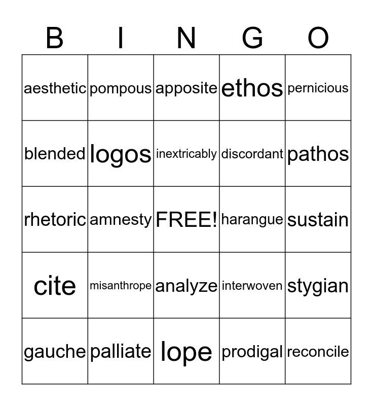 This bingo card has a free space and 24 words: misanthrope, palliate, inextricably, gauche, pernicious, aesthetic, blended, pompous, harangue, analyze, discordant, rhetoric, interwoven, stygian, logos, prodigal, sustain, apposite, pathos, amnesty, reconcile, cite, ethos and lope.