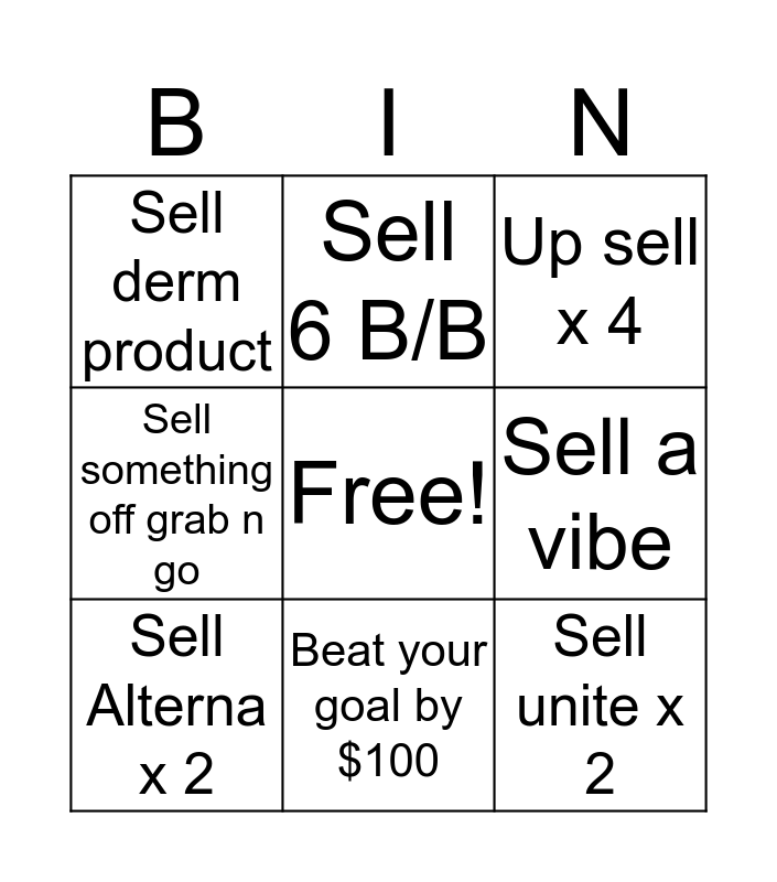 This bingo card has a free space and 11 words: Sell 6 P.O.M, Beat your goal by $100, Sell unite x 2, Sell Alterna x 2, Sell 6 B/B, Up sell x 4, Sell a vibe, Sell LC stuff x 5, Sell something off grab n go, Sell derm product and get 4 emails.