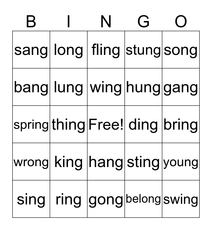 This bingo card has a free space and 24 words: king, ring, wing, sing, song, sang, bang, long, ding, hang, hung, spring, sting, young, lung, belong, bring, fling, gang, thing, swing, wrong, stung and gong.