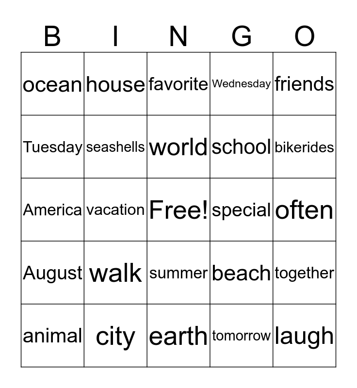 This bingo card has a free space and 24 words: walk, city, world, animal, friends, ocean, Tuesday, house, special, summer, school, America, beach, together, seashells, tomorrow, often, favorite, bikerides, vacation, laugh, August, Wednesday and earth.