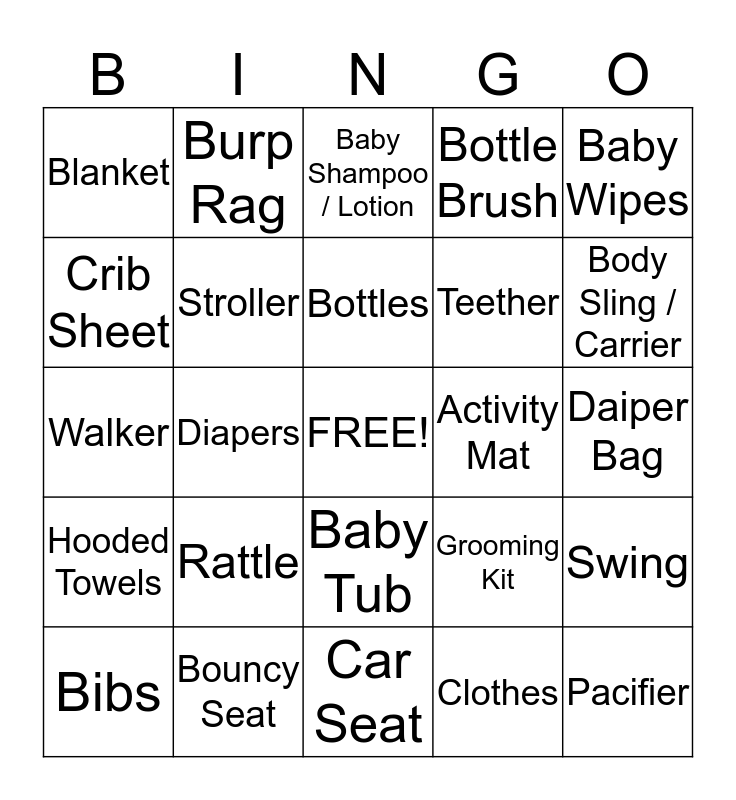 This bingo card has a free space and 24 words: Rattle, Bouncy Seat, Bottles, Bibs, Baby Wipes, Blanket, Crib Sheet, Burp Rag, Activity Mat, Baby Tub, Teether, Walker, Grooming Kit, Swing, Stroller, Clothes, Daiper Bag, Baby Shampoo / Lotion, Body Sling / Carrier, Diapers, Pacifier, Hooded Towels, Bottle Brush and Car Seat.