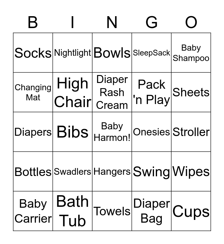 This bingo card has a free space and 29 words: Baby Carrier, Baby Lotion, Bibs, Pacifiers, Socks, Bowls, High Chair, Swadlers, Onesies, Bath Tub, Stroller, Cups, Towels, Diaper Bag, Sheets, Wash Cloth, Hangers, Bottles, Baby Shampoo, Diapers, Swing, Blanket, Pack 'n Play, Changing Mat, SleepSack, Nightlight, Wipes, Diaper Rash Cream and Baby Outfit.
