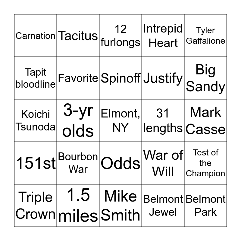 This bingo card has 35 words: Master Fencer, Big Sandy, 10, Favorite, Odds, Intrepid Heart, Tapit bloodline, Tax, Spinoff, Post position, Koichi Tsunoda, Tyler Gaffalione, Secretariat, 2:24, Carnation, 31 lengths, Belmont Jewel, 3-yr olds, 151st, Elmont, NY, War of Will, Triple Crown, Test of the Champion, 1.5 miles, 12 furlongs, Big Sandy, Belmont Park, 1867, Justify, Mark Casse, Sir Winston, Mike Smith, Bourbon War, Tacitus and Everfast.