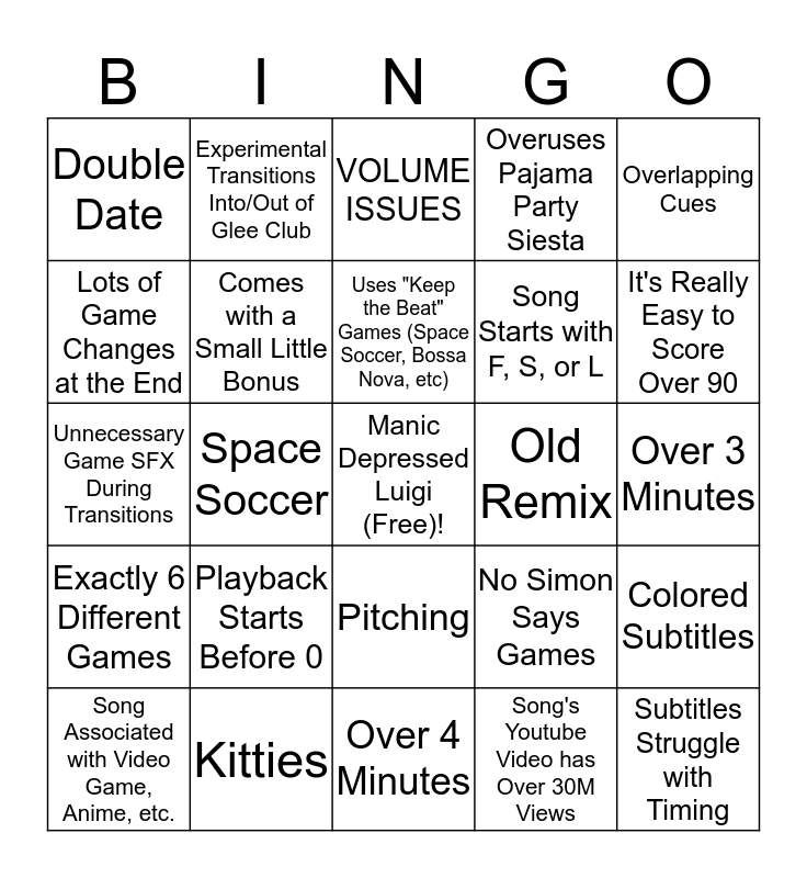 This bingo card has a free space and 30 words: Kitties, Built to Scale DS, Space Soccer, Fireworks, Double Date, VOLUME ISSUES, Comes with a Small Little Bonus, Pitching, Old Remix, Over 4 Minutes, Over 3 Minutes, Subtitles Struggle with Timing, Song's Youtube Video has Over 30M Views, Unsatisfying Skill Star, It's Really Easy to Score Over 90, Offsetting, No Simon Says Games, Exactly 6 Different Games, Playback Starts Before 0, Overlapping Cues, Unnecessary Game SFX During Transitions, Overuses Kitties Roll, Experimental Transitions Into/Out of Glee Club, Song Starts with F, S, or L, Lots of Game Changes at the End, Overuses Pajama Party Siesta, Colored Subtitles, Song Associated with Video Game, Anime, etc., Uses "Keep the Beat" Games (Space Soccer, Bossa Nova, etc) and Uses "Keep Up the Pattern" Games (Glee Club, Splashdown, etc).