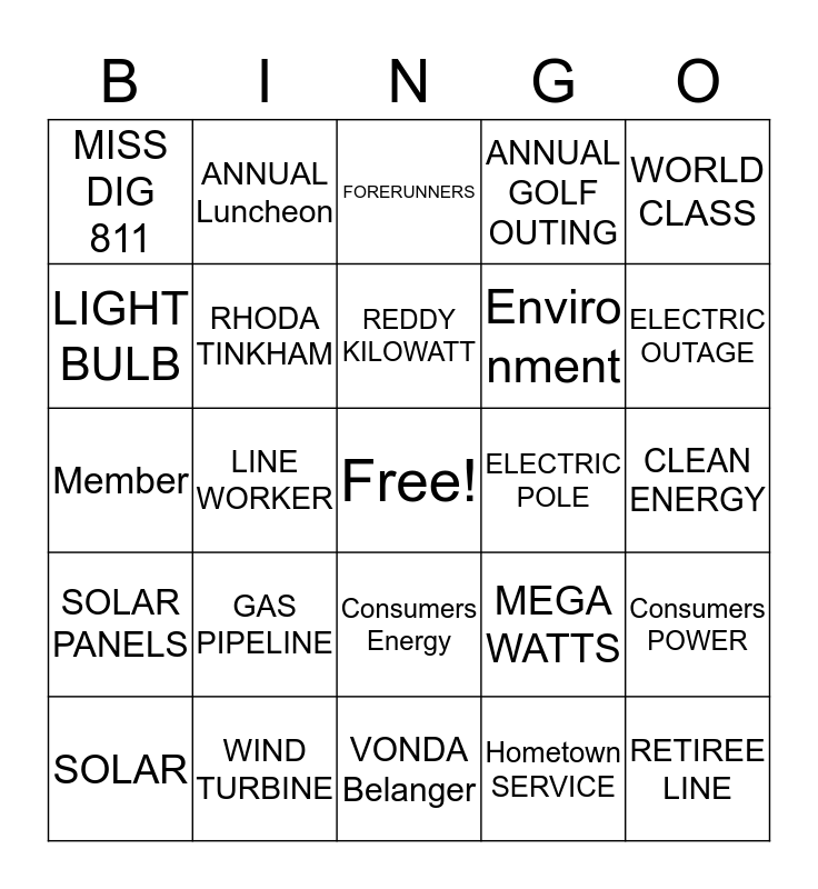 This bingo card has a free space and 29 words: SOLAR, UTILITY WORK, LINE WORKER, BUCKET TRUCK, MISS DIG 811, FORERUNNERS, RHODA TINKHAM, GAS PIPELINE, ELECTRIC POLE, WIND TURBINE, CLEAN ENERGY, RETIREE LINE, VONDA Belanger, Hometown SERVICE, ELECTRIC OUTAGE, Retirement, Consumers Energy, SOLAR PANELS, WORLD CLASS, Member, MEGA WATTS, PATTI POPPE CEO, Enviro nment, LIGHT BULB, ANNUAL GOLF OUTING, ANNUAL Luncheon, Consumers POWER, REDDY KILOWATT and MICHIGAN.