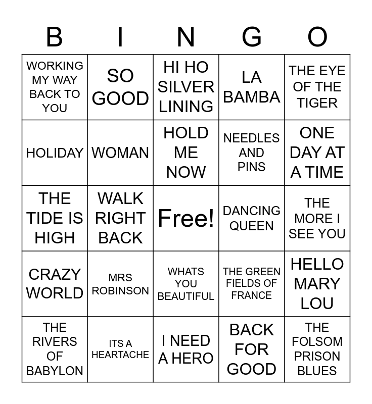 This bingo card has a free space and 43 words: CONGRATULATIONS, THE FOLSOM PRISON BLUES, QUANDO, THE RIVERS OF BABYLON, THE RING OF FIRE, BACK FOR GOOD, HI HO SILVER LINING, TAKE GOOD CARE OF MY BABY, THE EYE OF THE TIGER, ITS A HEARTACHE, LA BAMBA, DANCING QUEEN, WHATS YOU BEAUTIFUL, MRS ROBINSON, STRICTLY COME DANCING, I NEED A HERO, LEROY BROWN, THE TIDE IS HIGH, BLACK BETTY, ONE DAY AT A TIME, SO GOOD, MARYS PRAYER, WE GOT TONIGHT, WORKING MY WAY BACK TO YOU, MEMORIES ARE MADE OF THIS, THE MORE I SEE YOU, BEGIN THE BEGUINE, WE DIDNT START THE FIRE, THE GREEN FIELDS OF FRANCE, CRAZY WORLD, REBEL REBEL, HELLO MARY LOU, IF YOU LEAVE ME KNOW, WALK RIGHT BACK, HANDS UP, HALLELUJAH, THE GUITAR MAN, HOLD ME NOW, HOLIDAY, NEEDLES AND PINS, WE BUILT THIS CITY, WOMAN and WE ARE THE CHAMPTIONS.