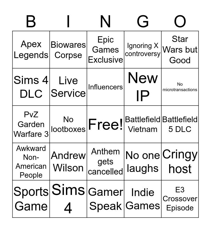 This bingo card has a free space and 24 words: Andrew Wilson, Sims 4, Influencers, Sports Game, Star Wars but Good, Apex Legends, Sims 4 DLC, Biowares Corpse, Battlefield Vietnam, Anthem gets cancelled, New IP, PvZ Garden Warfare 3, No one laughs, Cringy host, Live Service, Indie Games, Battlefield 5 DLC, Epic Games Exclusive, No microtransactions, No lootboxes, E3 Crossover Episode, Awkward Non-American People, Ignoring X controversy and Gamer Speak.