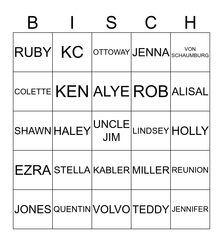 This bingo card has a free space and 24 words: STELLA, QUENTIN, ALYE, JONES, VON SCHAUMBURG, RUBY, COLETTE, KC, LINDSEY, KABLER, ROB, SHAWN, MILLER, REUNION, KEN, TEDDY, HOLLY, OTTOWAY, ALISAL, HALEY, JENNIFER, EZRA, JENNA and VOLVO.