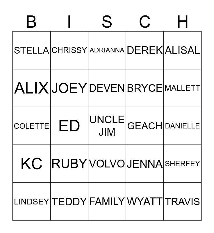 This bingo card has a free space and 24 words: RUBY, TEDDY, DEVEN, LINDSEY, ALISAL, STELLA, ALIX, CHRISSY, GEACH, VOLVO, BRYCE, COLETTE, JENNA, SHERFEY, JOEY, WYATT, DANIELLE, ADRIANNA, MALLETT, ED, TRAVIS, KC, DEREK and FAMILY.