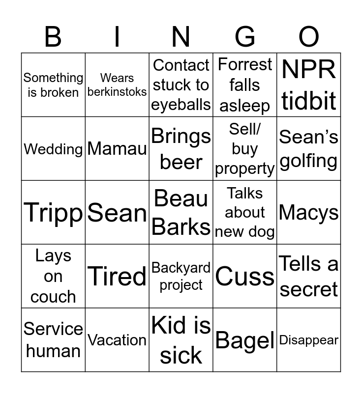 This bingo card has a free space and 24 words: Tired, Vacation, Brings beer, Service human, NPR tidbit, Something is broken, Wedding, Wears berkinstoks, Talks about new dog, Backyard project, Sell/ buy property, Tripp, Cuss, Tells a secret, Mamau, Bagel, Macys, Contact stuck to eyeballs, Sean’s golfing, Sean, Disappear, Lays on couch, Forrest falls asleep and Kid is sick.