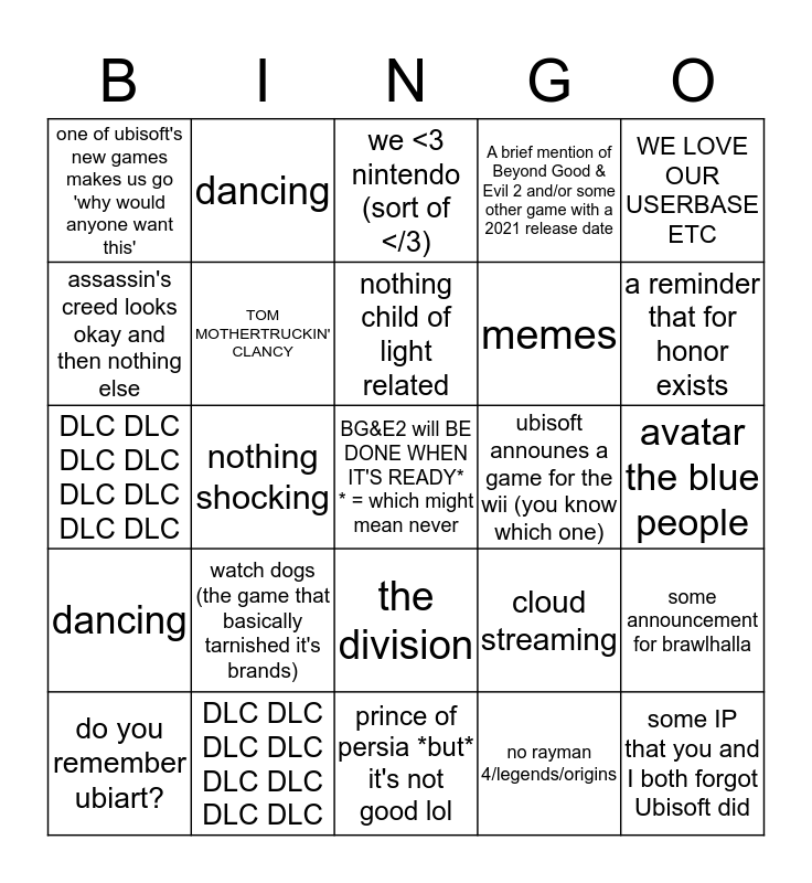 This bingo card has a free space and 24 words: watch dogs (the game that basically tarnished it's brands), DLC DLC DLC DLC DLC DLC DLC DLC, nothing child of light related, do you remember ubiart?, WE LOVE OUR USERBASE ETC, one of ubisoft's new games makes us go 'why would anyone want this', assassin's creed looks okay and then nothing else, dancing, ubisoft announes a game for the wii (you know which one), the division, memes, DLC DLC DLC DLC DLC DLC DLC DLC, cloud streaming, some announcement for brawlhalla, TOM MOTHERTRUCKIN' CLANCY, no rayman 4/legends/origins, avatar the blue people, we <3 nintendo (sort of </3), a reminder that for honor exists, nothing shocking, some IP that you and I both forgot Ubisoft did, dancing, A brief mention of Beyond Good & Evil 2 and/or some other game with a 2021 release date and prince of persia *but* it's not good lol.