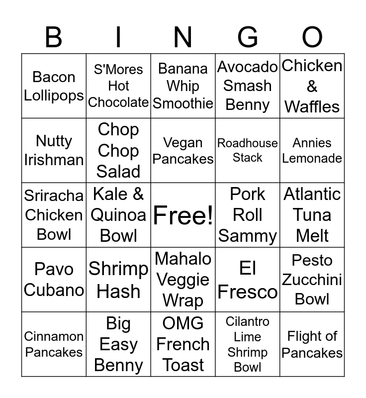 This bingo card has a free space and 25 words: Shrimp Hash, OMG French Toast, Vegan Pancakes, Cinnamon Pancakes, Chicken & Waffles, Bacon Lollipops, Nutty Irishman, S'Mores Hot Chocolate, Pork Roll Sammy, Mahalo Veggie Wrap, Roadhouse Stack, Sriracha Chicken Bowl, El Fresco, Pesto Zucchini Bowl, Chop Chop Salad, No Yolks Omelette, Atlantic Tuna Melt, Banana Whip Smoothie, Annies Lemonade, Kale & Quinoa Bowl, Flight of Pancakes, Big Easy Benny, Pavo Cubano, Avocado Smash Benny and Cilantro Lime Shrimp Bowl.