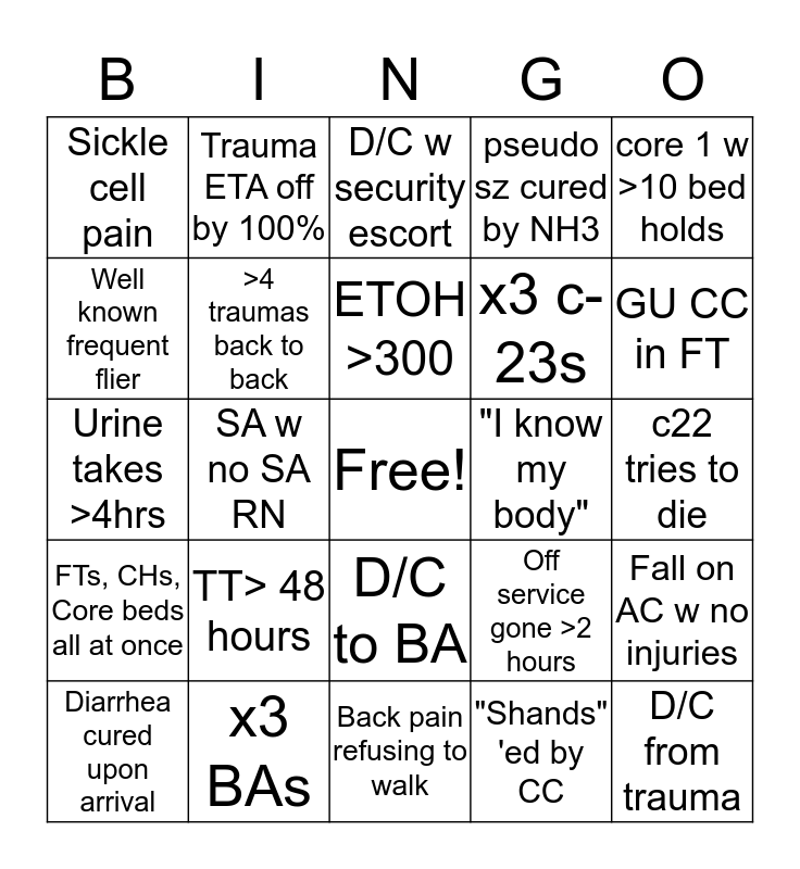 This bingo card has a free space and 24 words: TT> 48 hours, x3 BAs, ETOH >300, Diarrhea cured upon arrival, core 1 w >10 bed holds, Sickle cell pain, Well known frequent flier, Trauma ETA off by 100%, "I know my body", D/C to BA, x3 c-23s, Urine takes >4hrs, Off service gone >2 hours, Fall on AC w no injuries, >4 traumas back to back, "Shands" 'ed by CC, c22 tries to die, D/C w security escort, GU CC in FT, SA w no SA RN, D/C from trauma, FTs, CHs, Core beds all at once, pseudo sz cured by NH3 and Back pain refusing to walk.