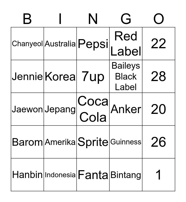This bingo card has 25 words: Barom, Indonesia, Coca Cola, Bintang, 22, Chanyeol, Australia, Pepsi, Anker, 26, Jennie, Korea, Fanta, Guinness, 28, Hanbin, Jepang, 7up, Baileys Black Label, 20, Jaewon, Amerika, Sprite, Red Label and 1.
