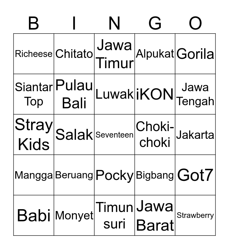 This bingo card has a free space and 24 words: Beruang, Monyet, Luwak, Babi, Gorila, Richeese, Siantar Top, Chitato, Choki-choki, Pocky, iKON, Stray Kids, Bigbang, Got7, Pulau Bali, Jawa Barat, Jakarta, Jawa Timur, Jawa Tengah, Salak, Strawberry, Mangga, Alpukat and Timun suri.