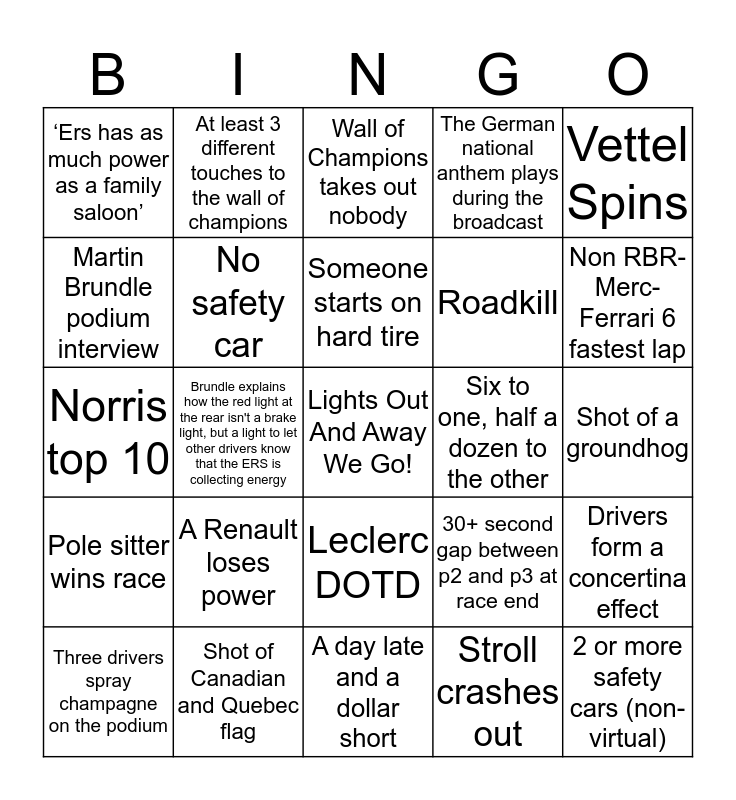 This bingo card has a free space and 24 words: A Renault loses power, Shot of Canadian and Quebec flag, Someone starts on hard tire, Three drivers spray champagne on the podium, Vettel Spins, ‘Ers has as much power as a family saloon’, Martin Brundle podium interview, At least 3 different touches to the wall of champions, Six to one, half a dozen to the other, Leclerc DOTD, Roadkill, Norris top 10, 30+ second gap between p2 and p3 at race end, Drivers form a concertina effect, No safety car, Stroll crashes out, Shot of a groundhog, Wall of Champions takes out nobody, Non RBR-Merc-Ferrari 6 fastest lap, Brundle explains how the red light at the rear isn't a brake light, but a light to let other drivers know that the ERS is collecting energy, 2 or more safety cars (non-virtual), Pole sitter wins race, The German national anthem plays during the broadcast and A day late and a dollar short.
