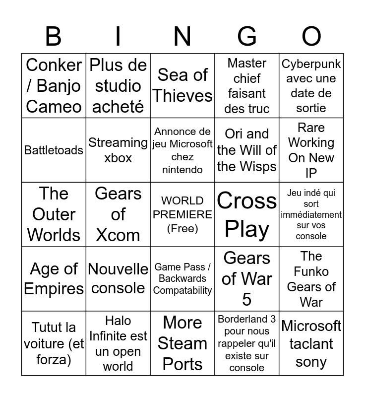 This bingo card has a free space and 24 words: Nouvelle console, Halo Infinite est un open world, Annonce de jeu Microsoft chez nintendo, Tutut la voiture (et forza), Cyberpunk avec une date de sortie, Conker / Banjo Cameo, Battletoads, Plus de studio acheté, Cross Play, Game Pass / Backwards Compatability, Ori and the Will of the Wisps, The Outer Worlds, Gears of War 5, The Funko Gears of War, Streaming xbox, Borderland 3 pour nous rappeler qu'il existe sur console, Jeu indé qui sort immédiatement sur vos console, Sea of Thieves, Rare Working On New IP, Gears of Xcom, Microsoft taclant sony, Age of Empires, Master chief faisant des truc and More Steam Ports.