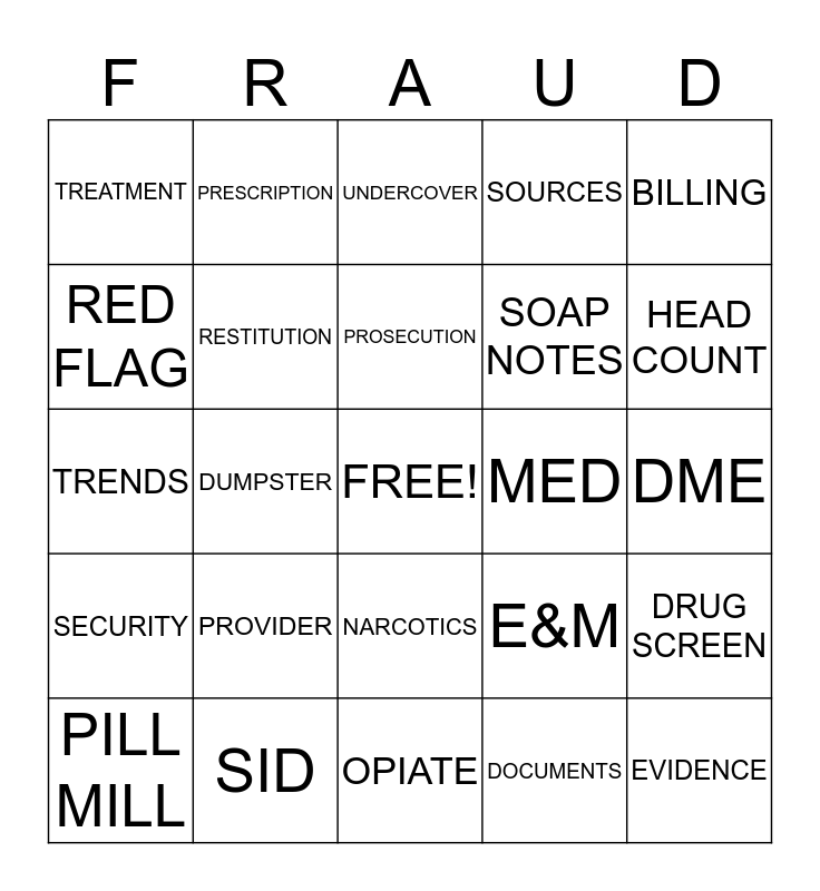 This bingo card has a free space and 24 words: PROVIDER, SID, PROSECUTION, PILL MILL, BILLING, TREATMENT, RED FLAG, PRESCRIPTION, MED, NARCOTICS, SOAP NOTES, TRENDS, E&M, DRUG SCREEN, RESTITUTION, DOCUMENTS, DME, UNDERCOVER, HEAD COUNT, DUMPSTER, EVIDENCE, SECURITY, SOURCES and OPIATE.