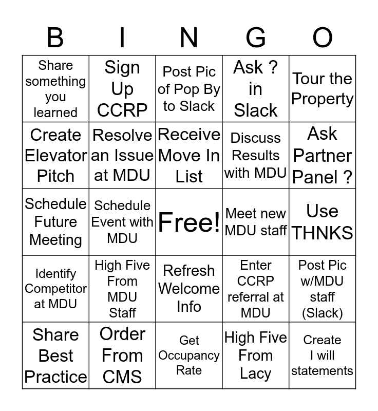 This bingo card has a free space and 24 words: High Five From MDU Staff, Order From CMS, Receive Move In List, Share Best Practice, Tour the Property, Share something you learned, Create Elevator Pitch, Sign Up CCRP, Meet new MDU staff, Refresh Welcome Info, Discuss Results with MDU, Schedule Future Meeting, Enter CCRP referral at MDU, Post Pic w/MDU staff (Slack), Resolve an Issue at MDU, High Five From Lacy, Use THNKS, Post Pic of Pop By to Slack, Ask Partner Panel ?, Schedule Event with MDU, Create I will statements, Identify Competitor at MDU, Ask ? in Slack and Get Occupancy Rate.