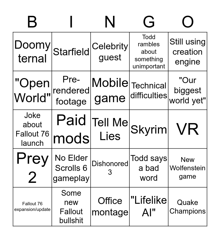 This bingo card has a free space and 24 words: No Elder Scrolls 6 gameplay, Some new Fallout bullshit, Mobile game, Fallout 76 expansion/update, Still using creation engine, Doomy ternal, "Open World", Starfield, Skyrim, Dishonored 3, Technical difficulties, Joke about Fallout 76 launch, Todd says a bad word, New Wolfenstein game, Pre-rendered footage, "Lifelike AI", VR, Celebrity guest, "Our biggest world yet", Paid mods, Quake Champions, Prey 2, Todd rambles about something unimportant and Office montage.