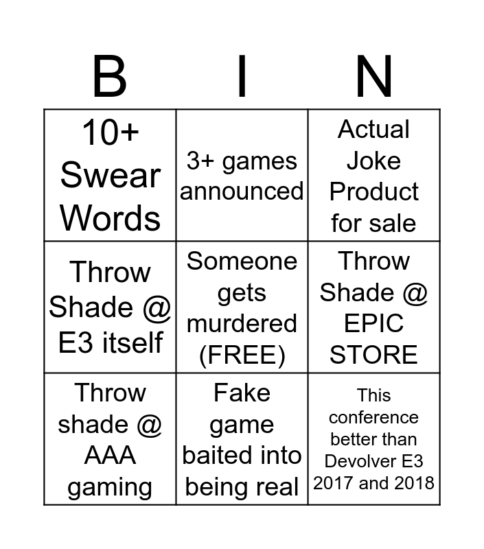 This bingo card has a free space and 8 words: Throw Shade @ EPIC STORE, Actual Joke Product for sale, 3+ games announced, Throw shade @ AAA gaming, 10+ Swear Words, This conference better than Devolver E3 2017 and 2018, Throw Shade @ E3 itself and Fake game baited into being real.