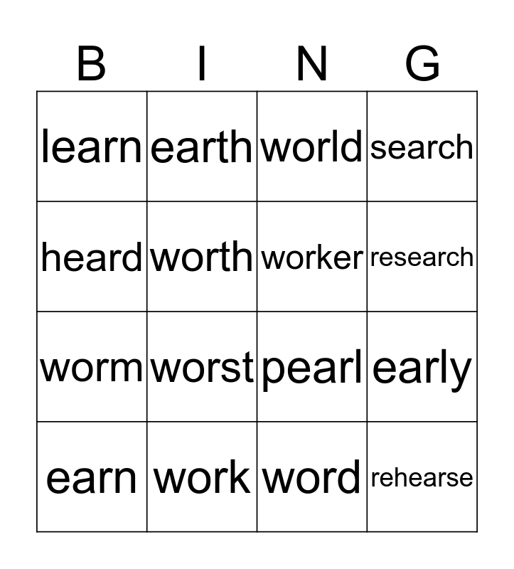 This bingo card has 16 words: work, early, world, learn, worm, earth, pearl, word, heard, worth, earn, search, worst, research, worker and rehearse.