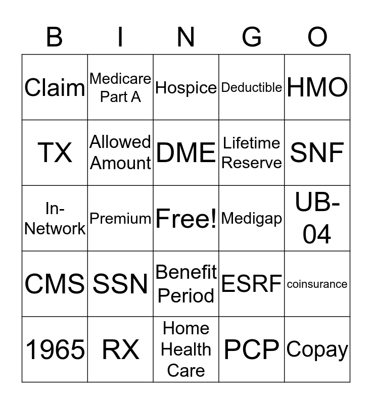 This bingo card has a free space and 24 words: SSN, RX, DME, 1965, HMO, Claim, TX, Medicare Part A, Medigap, Benefit Period, Lifetime Reserve, In-Network, ESRF, coinsurance, Allowed Amount, PCP, UB-04, Hospice, SNF, Premium, Copay, CMS, Deductible and Home Health Care.