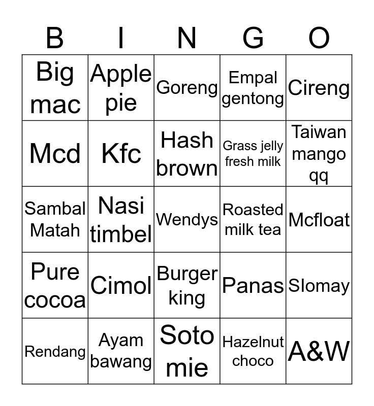 This bingo card has a free space and 24 words: Cimol, Ayam bawang, Hash brown, Rendang, Cireng, Big mac, Mcd, Apple pie, Roasted milk tea, Burger king, Grass jelly fresh milk, Sambal Matah, Panas, SIomay, Kfc, Hazelnut choco, Mcfloat, Goreng, Taiwan mango qq, Nasi timbel, A&W, Pure cocoa, Empal gentong and Soto mie.