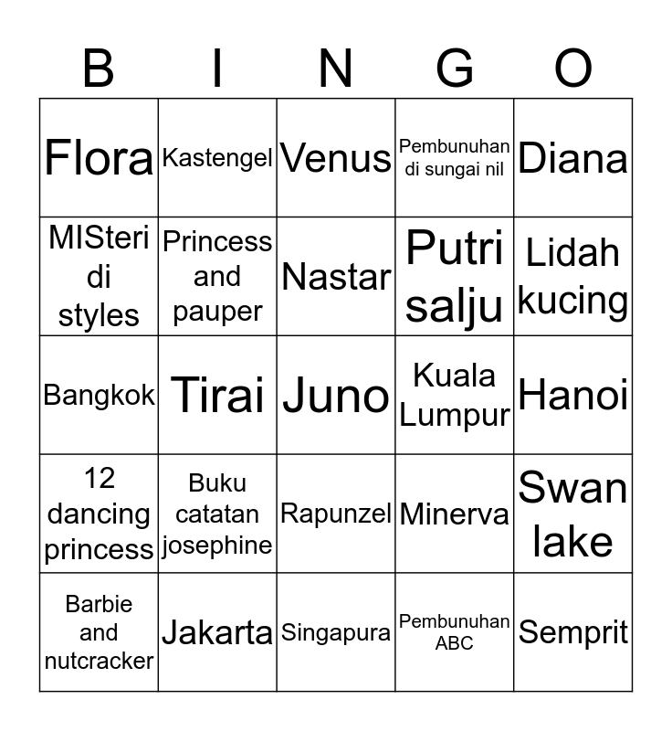 This bingo card has a free space and 24 words: Buku catatan josephine, Jakarta, Nastar, Barbie and nutcracker, Diana, Flora, MISteri di styles, Kastengel, Kuala Lumpur, Rapunzel, Putri salju, Bangkok, Minerva, Swan lake, Princess and pauper, Pembunuhan ABC, Hanoi, Venus, Lidah kucing, Tirai, Semprit, 12 dancing princess, Pembunuhan di sungai nil and Singapura.