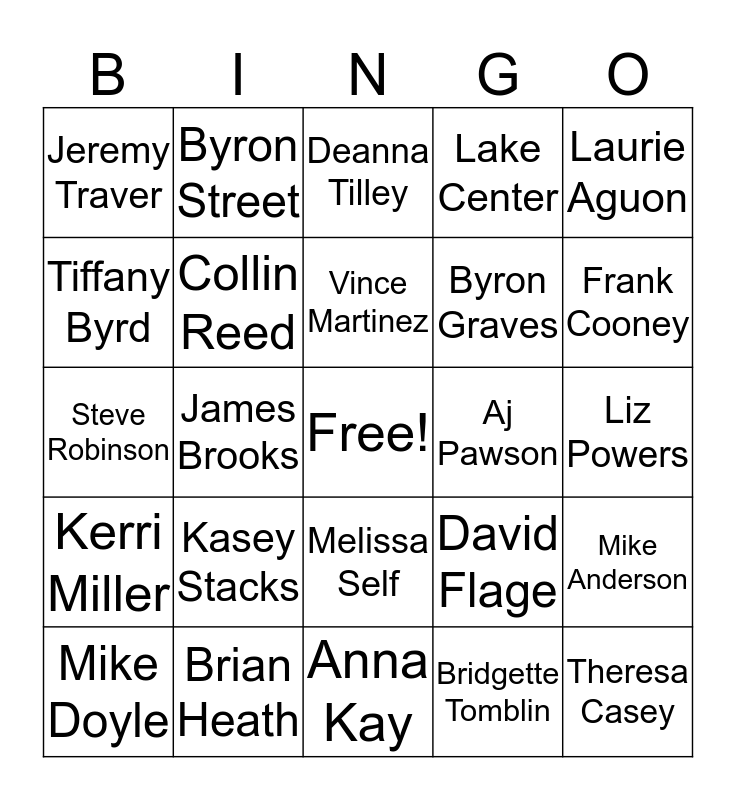 This bingo card has a free space and 29 words: Mike Doyle, Tyre King, James Brooks, Robert Jackson, Jeremy Traver, Deanna Tilley, Collin Reed, Kasey Stacks, Aj Pawson, Brian Heath, Liz Powers, Theresa Casey, Anna Kay, Bridgette Tomblin, Frank Cooney, Carla Grigg, Melissa Self, Kerri Miller, Laurie Aguon, Steve Robinson, David Flage, Eddie Mason, Byron Graves, Tiffany Byrd, Lake Center, Byron Street, Mike Anderson, Vince Martinez and Tom Dobry.